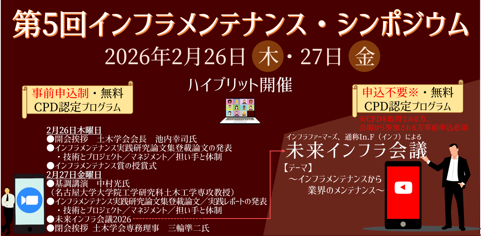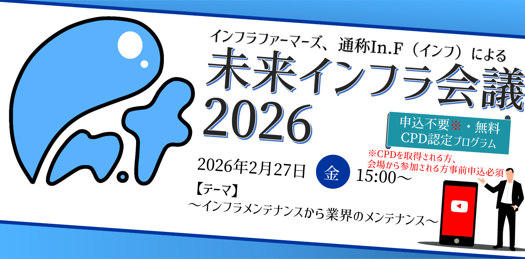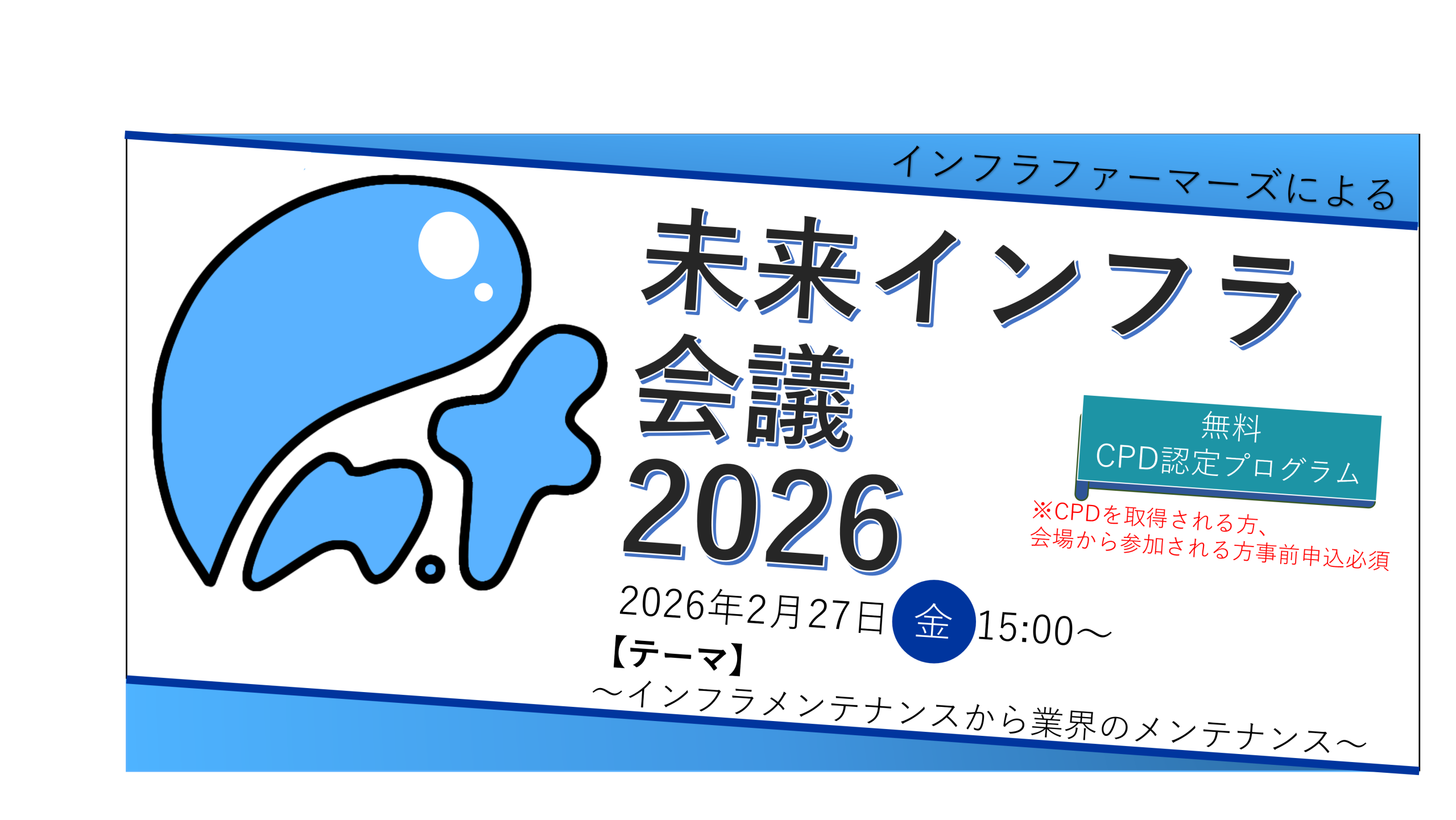HOME インフラメンテナンス・シンポジウム未来インフラ会議 What’s New! 未来インフラ会議2026 2026年1月6日 未来インフラ会議は、「インフラメンテナンスから業界 … Read More 第5回 インフラメンテナンス・シンポジウム 2026年1月5日 2026年2月26日(木)・27日(金)に『インフ … Read More 優秀講演者賞授賞者の発表 2025年3月10日 2025年2月27日(木)~28日(金)に土木学会 … Read More 未来インフラ会議 2025 2025年1月9日 昨年度までLIMNが運営していた橋守サミットの後続 … Read More 第4回 インフラメンテナンス・シンポジウム 2025年1月9日 2025年2月27日(木)・28日(金)に『インフ … Read More 橋守サミット2024 アーカイブ配信開始 2024年3月8日 2月29日木曜日に「橋守サミット2024」のYou … Read More 関連情報 インフラメンテナンス実践研究論文集の論文募集のお知らせ インフラメンテナンス分野の表彰制度の募集